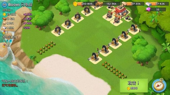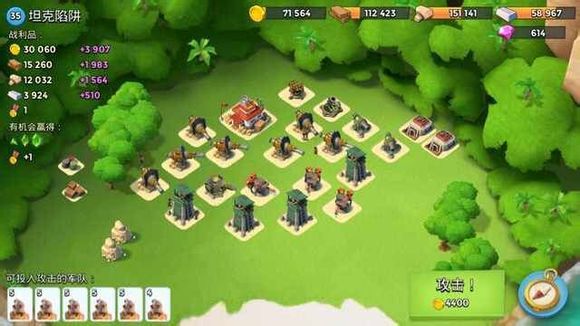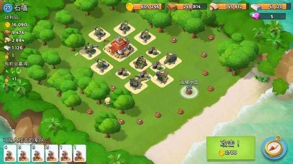 1野人,炸掉两个大加,右侧登陆,震爆打掉右侧4个防御,引导打掉左侧防御,再安心推本