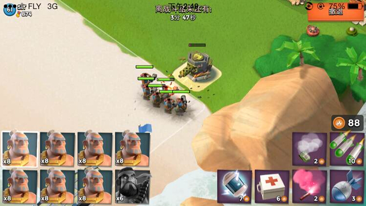 第一个烟雾先消失!周围的攻击型建筑会直接打胖子,胖子抗一波攻击火力,第二个烟雾跟着消失,野人爆本!