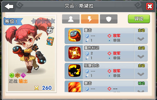 狂暴之心:攻击距离1,斯黛拉狂暴变身(防御力-30%,攻击力+50%,暴击率+30%),并对目标造成斯黛拉攻击力200%的伤害,变身状态持续2回合。