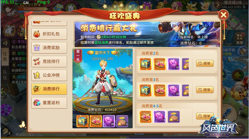 活动内容:活动期间,根据玩家累计消费钻石进行排名,合服第8天0点进行结算,根据排名发放奖励。