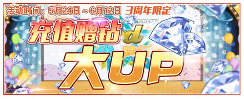 5月24日-6月12日,购买钻石可以获得额外的赠钻哦!各档位优惠活动均可享受4次。各档位充值满3轮可购买超值大礼包!