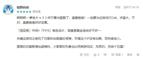 在TapTap上,有许多之前体验过日服的粉丝玩家纷纷留言,期待《梦色卡司》简体中文版早日开测,表达了他们对于《梦色卡司》游戏品质的认可,也希望未来中文版能继续实现他们“剧本家”的梦想。