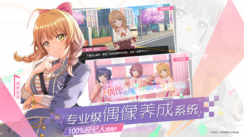 《AKB48樱桃湾之夏》以樱桃湾为背景,玩家将来到这里担当一名专业的偶像经纪人。游戏以100%经纪人视角记录打造偶像的全过程,专业级的养成体系让每一位玩家都能够深入了解偶像经营的过程,在本次先锋测试中,玩家们将伴随着开放的主线故事、日常沟通、人气工作等方方面面初步探究偶像养成的内容。